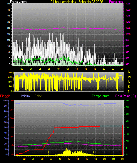 Velocità massima di raffica = 29.6 km/h da 274°( W ) giorno 03 tempo 12:19
