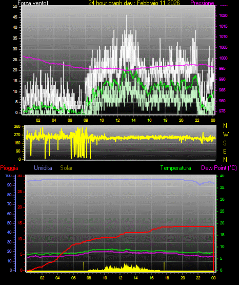 Il massimo windspeed = 27.8 kmh from 184°( S ) giorno 16 tempo 17:02