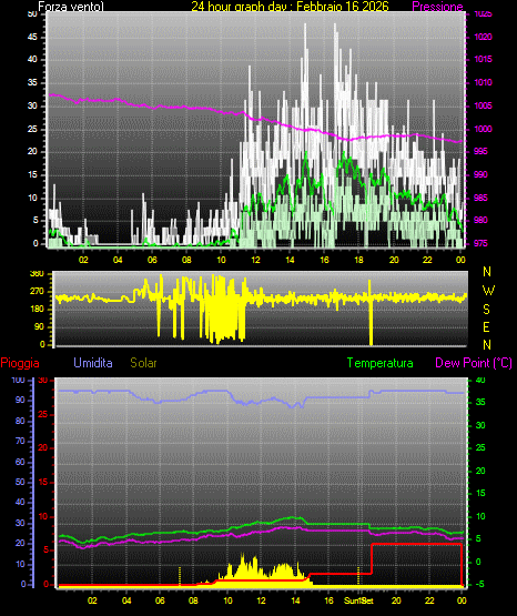Velocità massima di raffica = 48.1 km/h da 243°(WSW) giorno 16 tempo 16:34