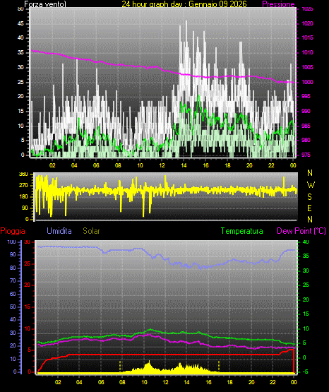 Velocità massima di raffica = 46.3 km/h from 248°(WSW) giorno 09 tempo 14:16