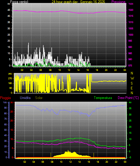 Velocità massima di raffica = 16.7 km/h da 347°(NNW) giorno 04 tempo 16:02