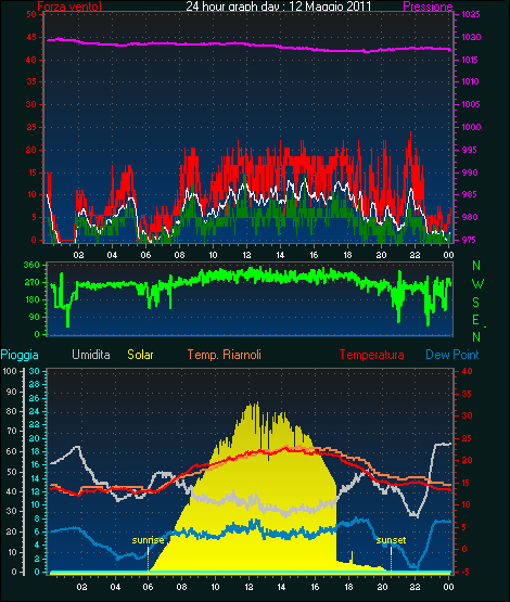 Fire Weather Index Values FFMC = 0.0 DMC = 0.0 BUI = 0.0 ISI = 0.0 DC = 0.0 FWI = 0.0Medie \ estremi per il giorno: 03 ------------------------------------------------------------Media temperatura = 13.9°C Media umidita = 80% Media dewpoint = 10.3°C Media pressione = 1003.1 hPa Media forza media vento = 8.6 km/h Media massima forza = 12.4 km/h Media direzione vento = 290° (WNW) Pioggia questo mese = 0.0 mm Pioggia questo anno = 262.3 mm Pioggia questo Giorno = 0.0 mm Massima pioggia per minuto = 0.0 mm giorno 03 tempo 23:57 Temperatura massima = 18.9°C giorno 03 tempo 15:50 Temperatura minima = 10.3°C giorno 03 tempo 04:26 Massima umidita = 97% giorno 03 tempo 07:33 Mimima umidita = 60% giorno 03 tempo 13:52 Maximum dewpoint = 13.1°C giorno 03 tempo 15:23 Minimum dewpoint = 5.0°C giorno 03 tempo 23:57 Pressione massima = 1006.5 hPa giorno 03 tempo 23:38 Pressione minima = 1001.2 hPa giorno 03 tempo 06:31 Il massimo windspeed = 22.2 km/h giorno 03 tempo 20:15 Velocità massima di raffica = 31.5 km/h da 270°( W ) giorno 03 tempo 19:23 Massima Indice calore = 25.4°C giorno 03 tempo 13:52 Premi qui per gli oggi 24 grafici di ora :3 :5 :2011