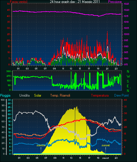 Fire Weather Index Values FFMC = 0.0 DMC = 0.0 BUI = 0.0 ISI = 0.0 DC = 0.0 FWI = 0.0 Medie \ estremi per il giorno: 22 ------------------------------------------------------------Media temperatura = 19.3°C Media umidita = 55% Media dewpoint = 9.6°C Media pressione = 1016.4 hPa Media forza media vento = 4.0 km/h Media massima forza = 6.4 km/h Media direzione vento = 102° (ESE) Pioggia questo mese = 7.0 mm Pioggia questo anno = 269.3 mm Pioggia questo Giorno = 1.0 mm Massima pioggia per minuto = 0.2 mm giorno 22 tempo 17:30 Temperatura massima = 26.7°C giorno 22 tempo 16:30 Temperatura minima = 13.6°C giorno 22 tempo 04:18 Massima umidita = 77% giorno 22 tempo 04:19 Mimima umidita = 31% giorno 22 tempo 16:45 Maximum dewpoint = 14.9°C giorno 22 tempo 18:50 Minimum dewpoint = 7.1°C giorno 22 tempo 13:13 Pressione massima = 1018.5 hPa giorno 22 tempo 22:59 Pressione minima = 1015.1 hPa giorno 22 tempo 16:48 Il massimo windspeed = 31.5 km/h giorno 22 tempo 17:21 Velocità massima di raffica = 42.6 km/h da 090°( E ) giorno 22 tempo 17:22 Massima Indice calore = 26.4°C giorno 22 tempo 16:29 Premi qui per gli oggi 24 grafici di ora :22 :5 :2011
