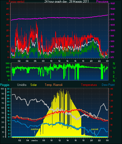 Fire Weather Index Values FFMC = 0.0 DMC = 0.0 BUI = 0.0 ISI = 0.0 DC = 0.0 FWI = 0.0 Medie \ estremi per il giorno: 28 ------------------------------------------------------------Media temperatura = 17.4°C Media umidita = 60% Media dewpoint = 9.1°C Media pressione = 1011.6 hPa Media forza media vento = 8.7 km/h Media massima forza = 13.2 km/h Media direzione vento = 275° ( W ) Pioggia questo mese = 7.8 mm Pioggia questo anno = 270.1 mm Pioggia questo Giorno = 0.0 mm Massima pioggia per minuto = 0.0 mm giorno 28 tempo 23:50 Temperatura massima = 23.0°C giorno 28 tempo 16:15 Temperatura minima = 13.1°C giorno 28 tempo 23:34 Massima umidita = 88% giorno 28 tempo 00:48 Mimima umidita = 34% giorno 28 tempo 16:17 Maximum dewpoint = 13.8°C giorno 28 tempo 00:32 Minimum dewpoint = 0.8°C giorno 28 tempo 21:15 Pressione massima = 1014.2 hPa giorno 28 tempo 23:50 Pressione minima = 1009.4 hPa giorno 28 tempo 00:02 Il massimo windspeed = 25.9 km/h giorno 28 tempo 06:22 Velocità massima di raffica = 33.3 km/h da 270°( W ) giorno 28 tempo 06:15 Massima Indice calore = 26.1°C giorno 28 tempo 19:10 Premi qui per gli oggi 24 grafici di ora :28 :5 :2011