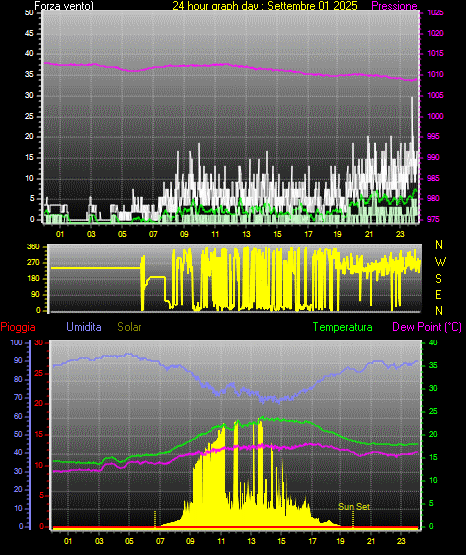 Velocità massima di raffica = 29.6 km/h da 250°(WSW) giorno 01 tempo 23:49